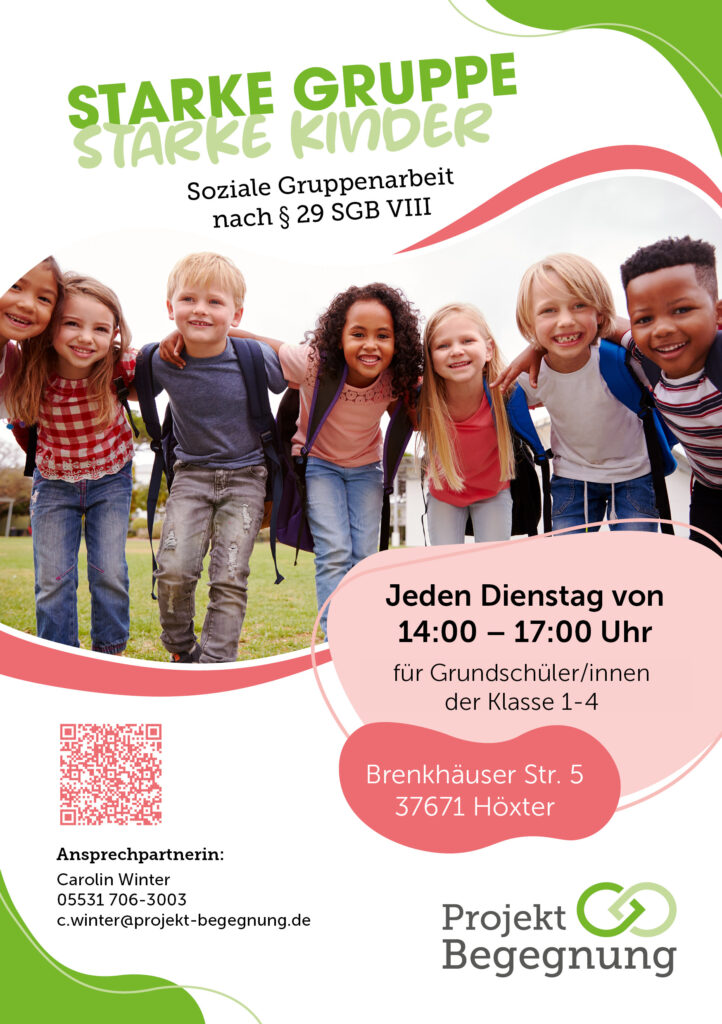 Unsere Soziale Gruppenarbeit richtet sich an Grundschulkinder der Klassen 1–4 und findet jeden Dienstag von 14:00 bis 17:00 Uhr statt. In einer festen Gruppe von bis zu acht Kindern werden soziale Kompetenzen, Selbstvertrauen und der Umgang mit Gefühlen gezielt gefördert.